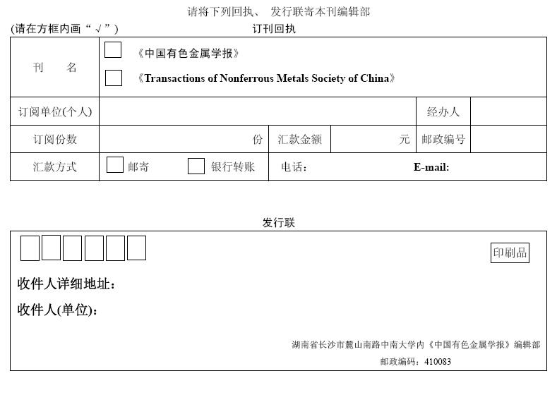 匯款地址:湖南省長(zhǎng)沙市麓山南路中南大學(xué)內(nèi)《中國(guó)有色金屬學(xué)報(bào)》編輯部,郵政編碼:410083