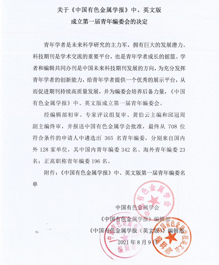 關(guān)于《中國有色金屬學(xué)報》中、英文版成立第一屆青年編委會的決定