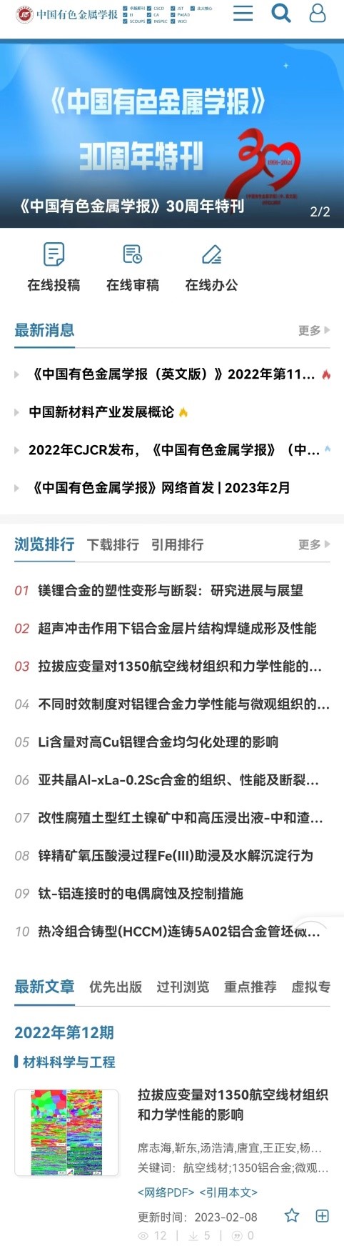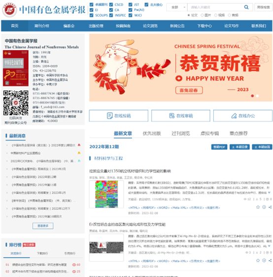 為適應(yīng)新時代學(xué)術(shù)期刊融合發(fā)展的需要,更好地服務(wù)用戶,《中國有色金屬學(xué)報》中文版期刊網(wǎng)站進(jìn)行了改版升級,將于2023年3月6日全新上線,以期為廣大讀者、作者以及專家等用戶提供更好的閱讀服務(wù)和使用體驗。